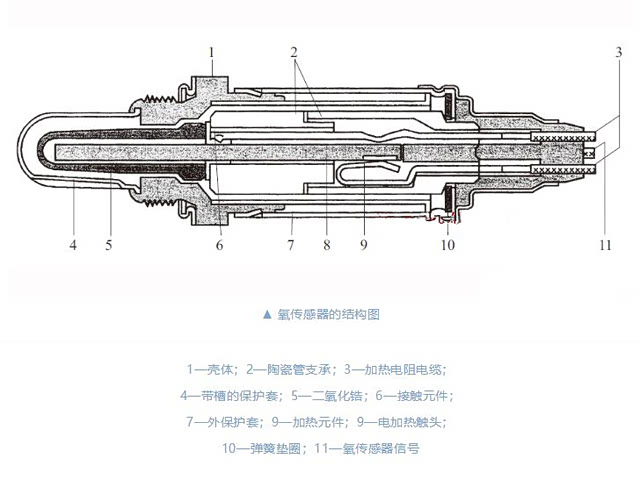 传感器的作用是测定发动机燃烧后的排气中氧是否过剩的信息,即氧气含量,并把氧气含量转换成电压信号传递到发动机计算机,使发动机能够实现以过量空气因数为目标的闭环控制。