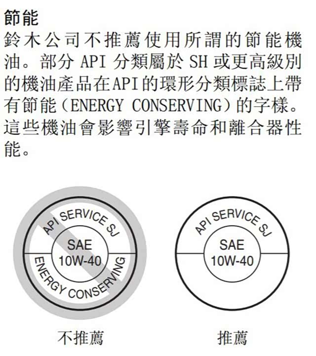 市售机油至少都有SJ等级以上,另外标志底下标有「ENERGY CONSERVING 」表示具省油性质,但要注意的是,并非所有车款都适合使用具省油性值的机油,还是得参考原厂建议做挑选。