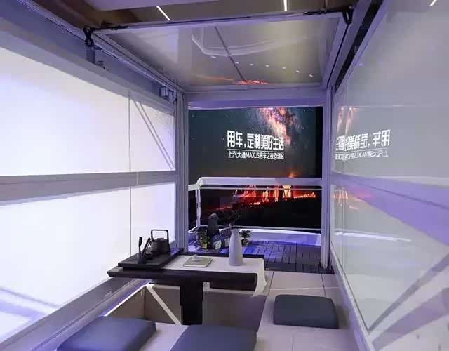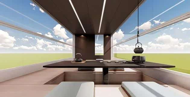 上面也是皮质地板,实木茶台是电动升降的,上面可以根据自己的意愿,随时转换成多场景,变成书房、会客厅、健身房都行,空中阳光房的四面是电池玻璃,可任意一键切换变成隐私空间,前后玻璃都是庭院式入户门设计,向上滑动,可以隐藏到车顶。