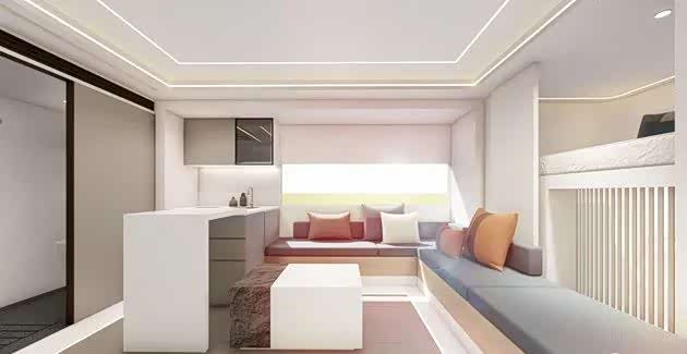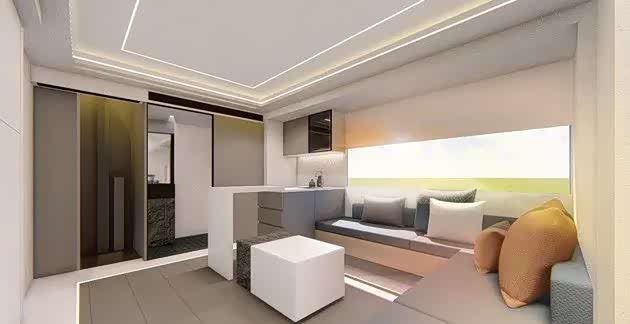 睡觉区域就在额头床上,内饰设计非常奢华,采用高品质家具,肌理漆墙与天花板,还有哑光混水漆木,一起搭配成深色细腻和浅色颗粒的强烈对比色,皮革材质的地面,细腻的质感,整体的简洁流线,很有未来的家具风,看起来就非常的清爽。