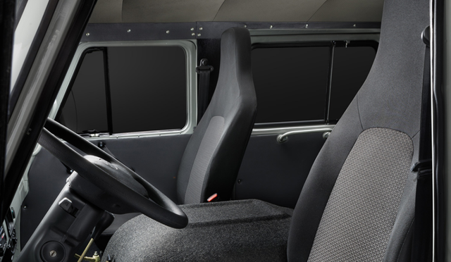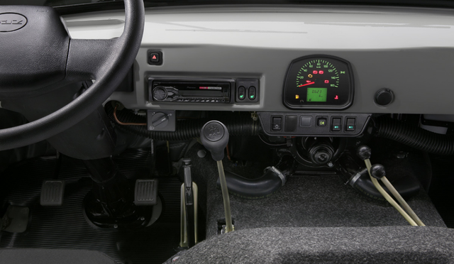 当然,越野嘛,要的就是硬核到底,两幅式的方向盘、织物座椅、长杆状的换挡机构、只显示时速的仪表,还有一个大储物格。当然了,据说这台车是可以选装收音机、座椅加热、驾驶舱和行李舱隔板等配置的。