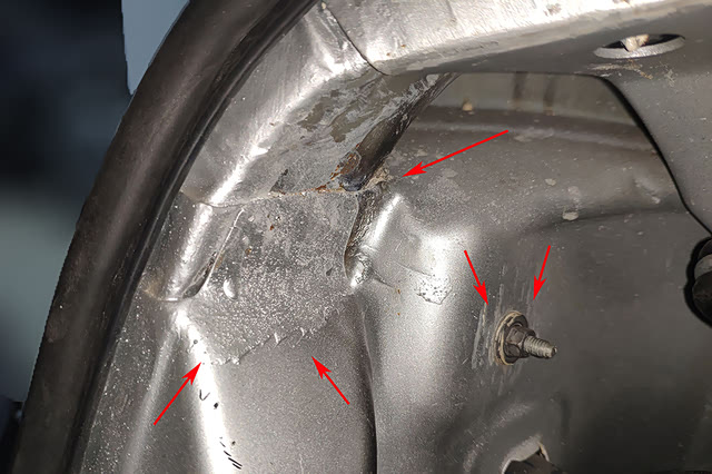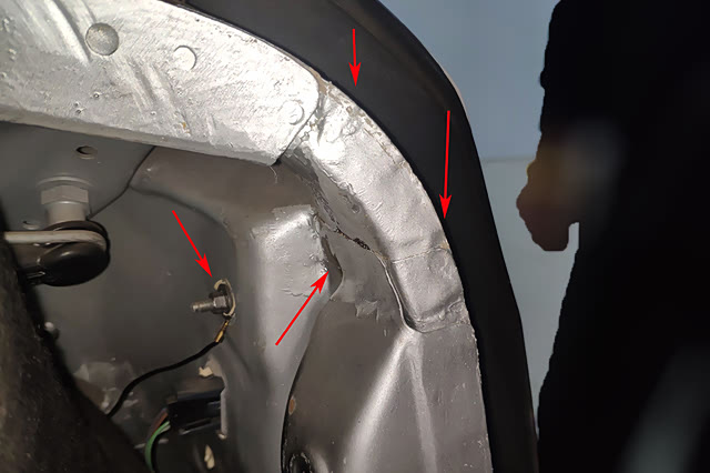 扒开饰板看后围板部位,可以看到后尾灯的固定螺丝和后部的钣金件,检查后发现有事故撞击修复的痕迹,至于尾灯本身肯定保不住了...由此可以断定这台车尾部必然有过追尾事故的发生,具体撞到了哪部分我们只能等底盘检测的时候才能看到了。