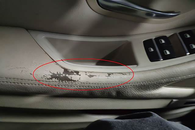 检测方向盘功能键及中控功能键的时候未发现功能键存在异常,但是在驾驶位门把手的扣手上发现了包括材质老化脱落的痕迹,这是这一代5系的通病...