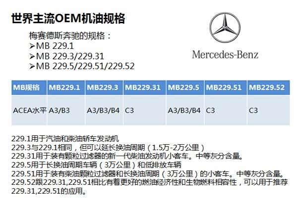奔驰现在在国内的主要规格是MB 229.3和MB 229.5比较多一些,这两个规格的ASEA标准都是A3/B4的。国内奔驰用油的粘度主要包括0W-40、5W-40会比较多一些,但是最新的也有5W-30的粘度级别了。奔驰和宝马一样,也要选择满足ASEA A3/B4的产品,如果是柴油机选择C3的规格。