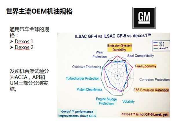 通用的规格主要有两个:Dexos 1和Dexos 2。Dexos 1用在汽油发动机上;Dexos 2是汽柴通用的(主要是在欧洲的规格)。目前上海通用推出的发动机主要用的油品是Dexos 1。目前Dexos 1在国内主推的是5W-30粘度,相对于普通的SN或者是ILSAC GF-5,Dexos 1的油品在保护性方面要更强一些,但是燃油经济性方面稍微差点。车主在选油的时候,最好是选择有Dexos 1标准的油品。如果没有的话,那也一定要选择满足SN或者是是ILSAC GF-5的5W-30的产品来使用。