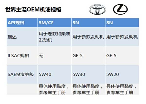 除了5W-40以外,其他三个产品全部是要求满足ILSAC GF-5的,这也可以理解丰田车为什么省油。但是丰田车的这几个粘度规格不是所有发动机都可以用的,具体使用要参照车主手册,因为丰田公司对不同发动机推荐的油品粘度也是不一样的。