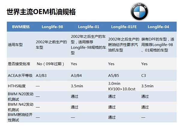 宝马现在在国内主要推荐的油品规格是Longlife-01(相当于ACEA A3/B4),在此基础上,宝马会增加一些自己的发动机测试要求。通常是A3/B4规格的合成油,推荐的粘度有5W-30、0W-40、5W-40。另外注意,只有满足ACEA A3/B4标准的油品才可以,普通的API规格和ILSAC规格的5W-30产品是不能用的。