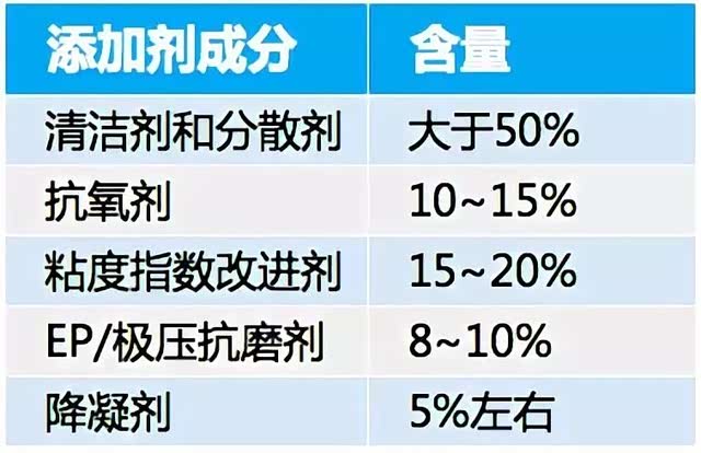 机油的添加剂旨在加强机油的几大功能:润滑功能、清洁功能、冷却功能和抗氧化功能等。其成分大致如下,在后面我们会详解。