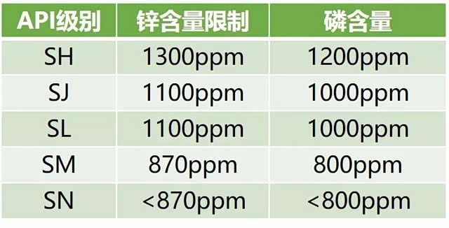 API分级(部分依据)汽油发动机所用的机油一般表示为SJ、SL、SM和SN,其中S代表汽油机油,J、L、M和N表示其品质等级的级别。其中,区分各个级别重要指标就是锌和磷。对这两种元素的限制,是为了通过减少汽车尾气中重金属含量,降低PM2.5带来的污染。