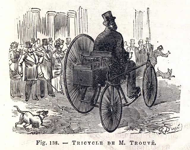 - 1880年,法国电气工程师、发明家Gustave Trouvé将一台经他改进的西门子小型电动马达安装在一台英国产三轮自行车上,从而诞生了全球首台电动汽车。