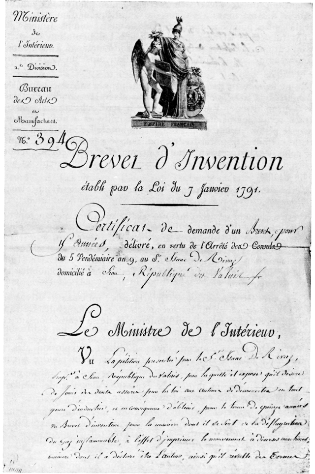 - 1807年,瓦莱共和国(如今瑞士的瓦莱州)炮兵军官出身的发明家François Isaac de Rivaz注册了一份专利——安装以电火花引燃可燃气体的内燃引擎驱动的车辆。