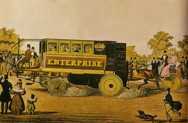 - 1829-1836年,英国发明家Walter Hancock同样以载人公路运输业务为目的制造了数台蒸汽动力汽车,除首台可载四人的三轮汽车外,另外八台被分别命名为:Infant、Infant II、Erin、Entreprise、Era、Autopsy、Drag、Automaton,其中一些已具备今天巴士的雏形,并于1836年5月实际应用于巴士业务。