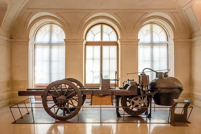 - 1769年,法国军械师Nicolas Joseph Cugnot制造了全球首台机动车—— 一台以低压锅炉为动力的火炮牵引平板车,史称:Fardier de Cugnot(居纽板车)。