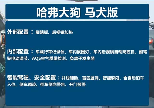 需要注意的是,中华田园犬版在配置上比马犬版有所降低。中华田园犬版提供18英寸轮毂,但提供了全尺寸备胎。相比马犬版,中华田园犬版减少了并线辅助、盲区监测、智慧躲闪、全自动泊车、倒车循迹、倒车侧向警告、开门预警,配置上基本与边牧版保持一致。