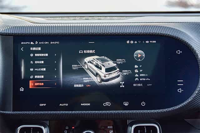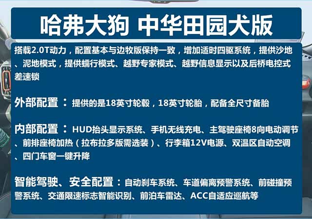 另外,中华田园犬版由于提供了四驱系统,增加了沙地、泥地两种全新的驾驶模式,并提供蠕行模式、越野专家模式、越野信息显示以及后桥电控式差速锁。