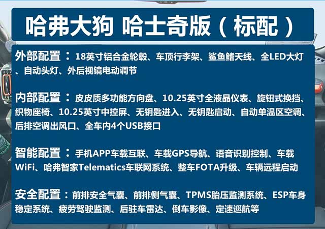 从配置来看,哈弗大狗哈士奇版的表现不错,提供了诸多高科技配置进行了标配。在外部配置方面,其提供了18英寸铝合金轮毂、车顶行李架、鲨鱼鳍天线、全LED大灯、自动头灯、外后视镜电动调节等。内部配置方面,其提供了皮质多功能方向盘、10.25英寸全液晶仪表、旋钮式换挡、织物座椅、10.25英寸中控屏、无钥匙进入、无钥匙启动、自动单温区空调、后排空调出风口、全车内4个USB接口等。