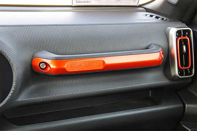 内饰方面,哈弗大狗仍旧使用了一种全新的设计风格,将现代设计与复古元素进行了融合。对称式中控台上颇为简洁,配色上则以黑色为主,在细节部分融合了橙金色元素,突出了科技感。