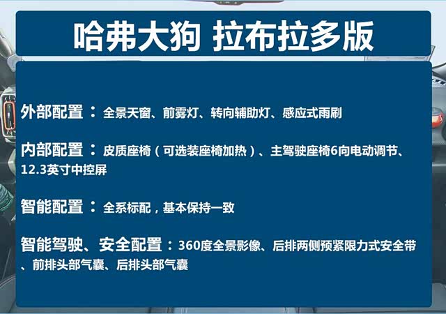 从配置上看,拉布拉多版的表现要比哈士奇版的表现更为全面,且增加了时下消费者需求的如全景天窗、感应式雨刷、皮质座椅等。不仅如此,新车还提供了前后排头部气囊,360度全景影像,进一步增加了车内的安全配置。