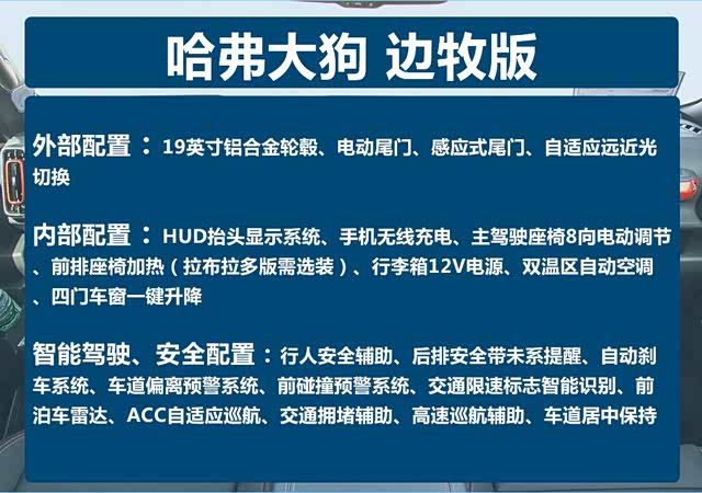 在智能驾驶、安全配置方面,边牧版升级明显,其提供了行人安全辅助、后排安全带未系提醒、自动刹车系统、车道偏离预警系统、前碰撞预警系统、交通限速标志智能识别、前泊车雷达、ACC自适应巡航、交通拥堵辅助、高速巡航辅助、车道居中保持。