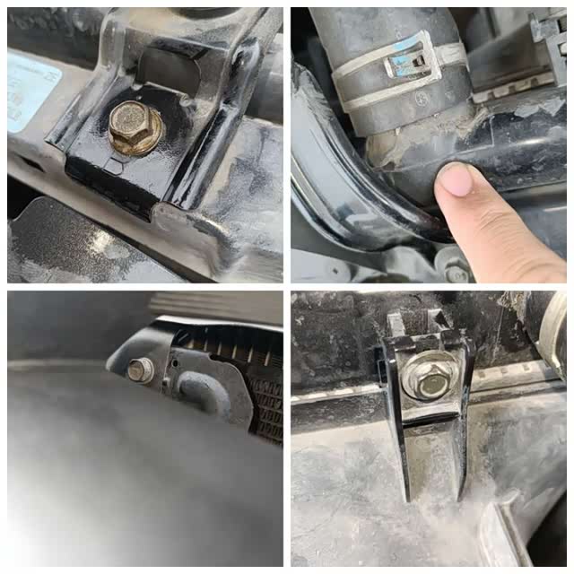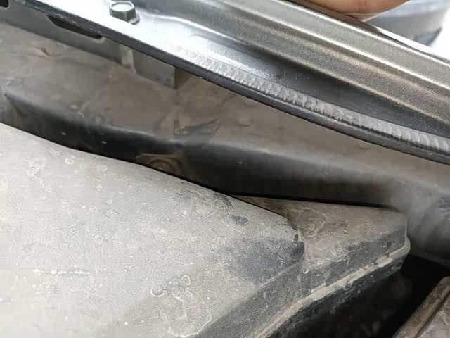 先看一下前防撞梁和两个纵梁,纵梁也就是大拿经常提到的四梁六柱中的其中之一,汽车框架结构中的主要部分,在纵梁前方固定的是前防撞横梁,它们组成一圈框架,把发动机舱保护起来,如果车辆发生了严重事故,前防撞梁和纵梁必然会有损伤。这台力狮的前防撞没有变形拆卸,纵梁也没有损伤修复,从侧面看上去很平整,保持了原厂状态,那么冷却系统的拆卸我们就可以排除左前事故的原因。