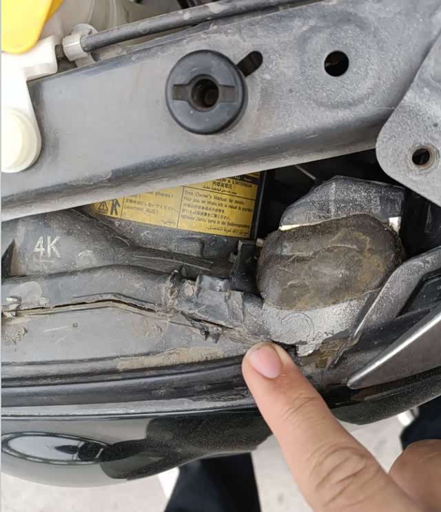来到大灯的位置,发现两个大灯有过改装,日系车大灯普遍没有制造日期,这就要凭借经验来判断了。不巧的是左前大灯灯爪折了一个,焊接打胶修复的痕迹非常明显,而且大灯也存在分解拆卸的现象,这可不是改装能解释得通的,看来左前还是有点儿故事。