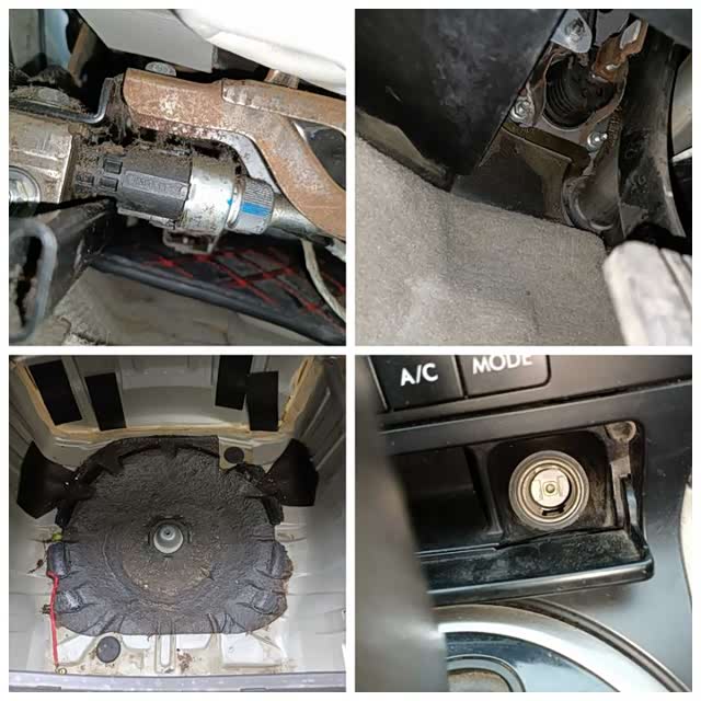 内饰一个主要检测项目就是查看有无泡水,那么就要从底部看起,大拿拿起手电筒一顿照耀,方向管柱、前排座椅骨架有生锈,哎呀!不会中招吧?不过看了地毯下部,后备箱底部,还有点烟器,安全带卡扣,仪表台这些位置,都没有生锈和残留泥沙的情况,也就排除了泡水的嫌疑。座椅骨架的生锈应该是时间长了反锈现象,并不是那种浸水产生的锈蚀。另外座椅螺丝有过拆卸,翻新座椅拆的,问题不大。