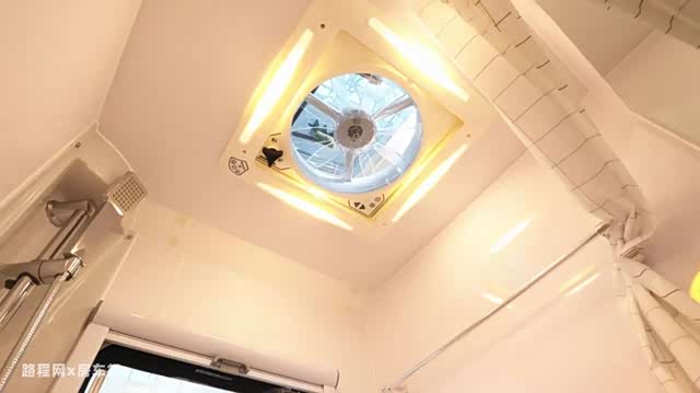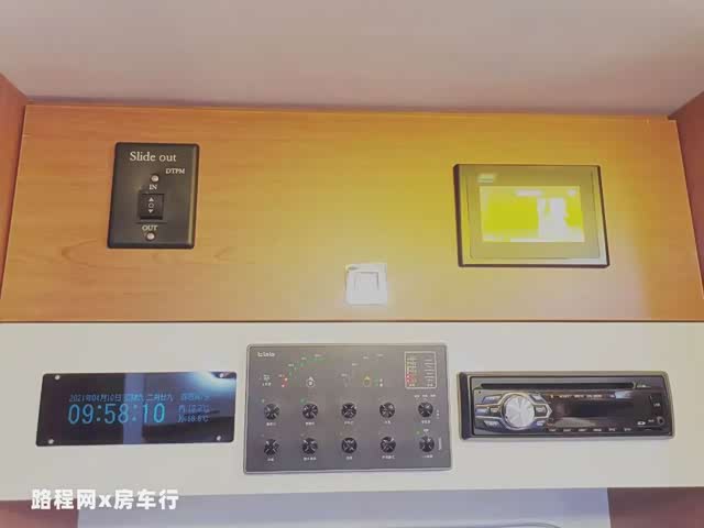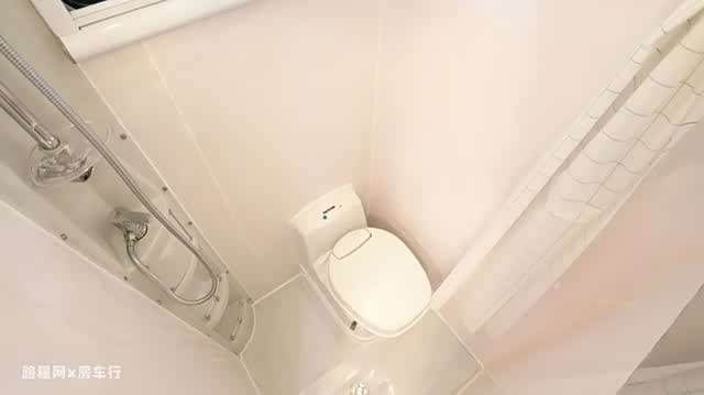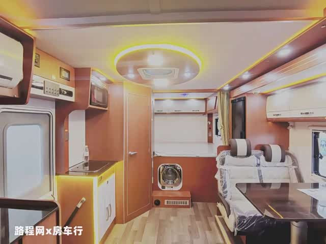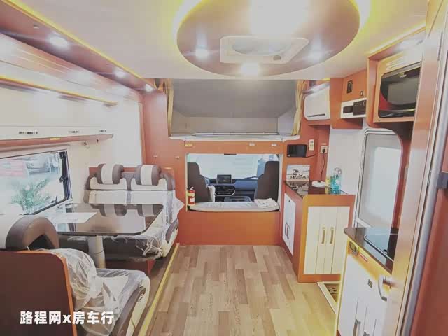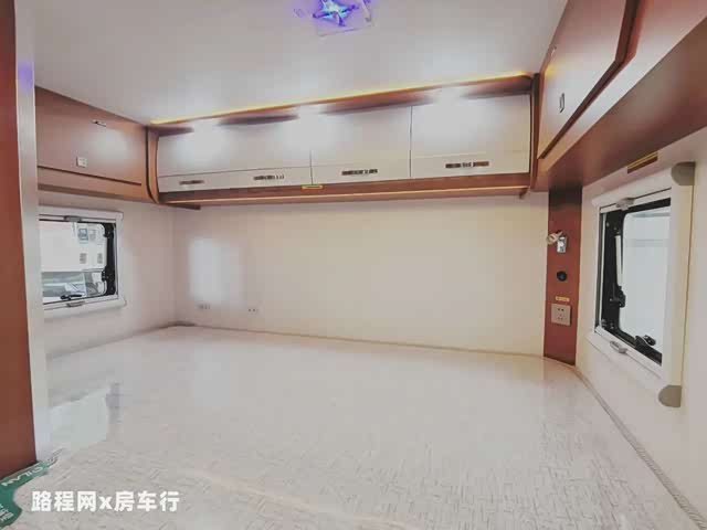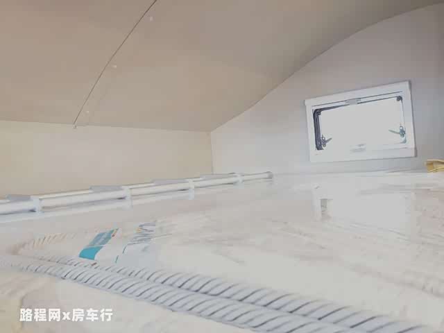 驾驶室正上方是一张额头双人床,两侧设计推窗有保证此处采光及通风。此外,额头床下嵌入了一台32寸液晶电视,整车内部还有为其配套的音响系统,旅途中观影娱乐很方便。