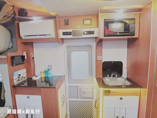 会客区对面便是整车的厨房区域,由中门隔开分为左右两个部分。左侧配置了空调、监控显示屏、置物台和储物柜;右半部分配置有微波炉、带盖板不锈钢水槽、水龙头、电源插座和储物柜了,整体配置可以满足日常做饭需求。
