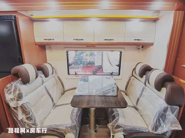 会客区采用经典的四人对坐卡座可升降桌的布局,卡座后方安置了一台185L超大冰箱。驻车休息时,会客桌椅还可拼床,尺寸适合儿童睡卧。此外,座椅上方配置了一排储物吊柜,可以收纳日常使用物品。