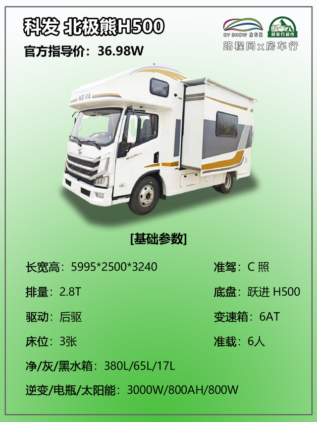 除了车内空间大,这款科发房车北极熊H500单拓展房车还拥有超大的水电配置,自驾旅行可以更加舒适便利。该车目前官方指导价为36.98W,大家觉得如何呢?欢迎评论区留言讨论。