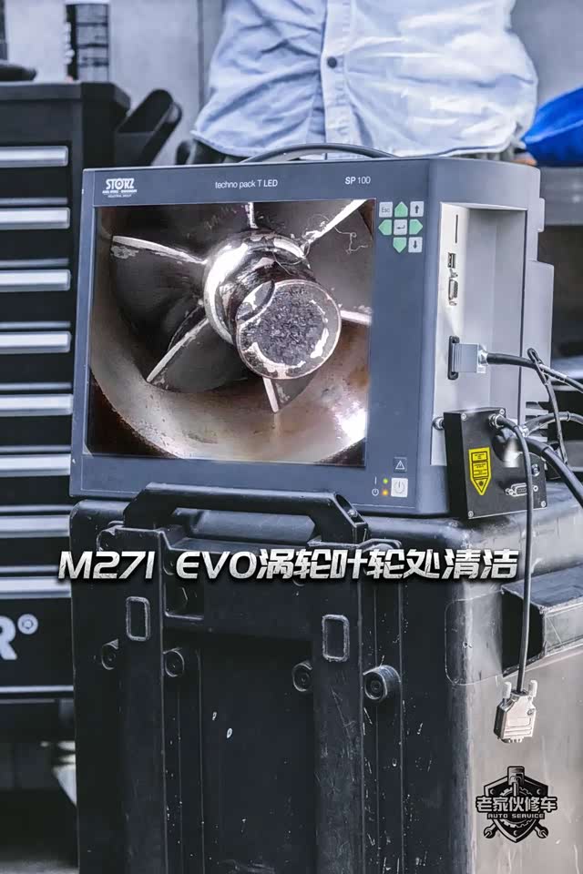 M271涡轮的叶轮有6片铝材、呈放射性曲面设计构成,这样的设计和材质主要目的是为了启动灵敏、能在较低的转速下介入工作。涡轮经常处于高速、高温的工作状态,温度在600度以上。对于这辆M271叶轮上的烧灼物是这样产生的,第一在涡轮引擎来说进气道的压力实在负压力和正压力两个状态下相互转化的,涡轮介入后进气压力就会变为正压,曲轴箱通风系统的低负荷油气分离管路的截断阀就会关闭,油气分离就会通过集成在气门室盖的迷宫式过滤器中通过废气管路到达涡轮叶轮前端,由叶轮输出的空气正压流入到进气歧管再燃烧。车主如果习惯性的高速立即灭车,油气分离的油粒和滤芯未过滤的灰尘颗粒会遗留在高温状态下的叶轮上灼烧沉积。