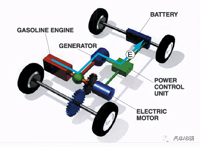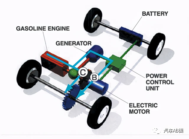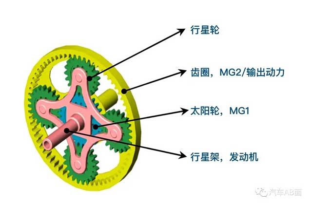THS结构图(图片来源:toyota)对于THS而言,电机与发动机既可以共同驱动车辆,也可以在串联模式下工作(电机驱动,发动机发电),属于典型的混联构型。实现多种工作模式的核心便是“功率分流装置”。