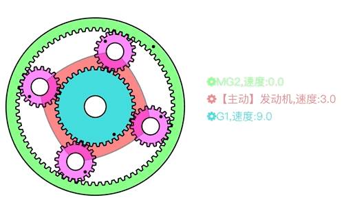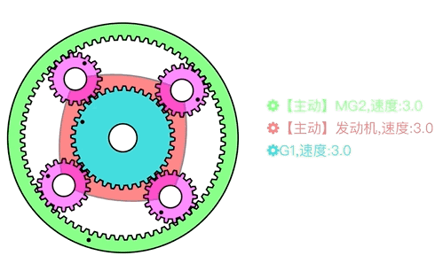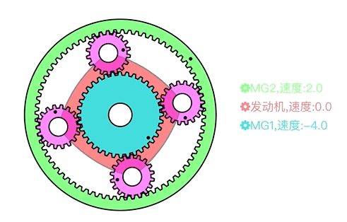 如果齿圈速度为0,发动机启动后,将带动MG开始发电,这时就是充电模式。