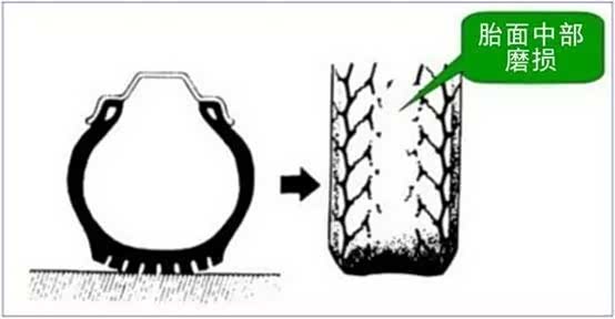 轮胎气压过高,充气过多,轮胎中央鼓起,会造成轮胎中间部位磨损。