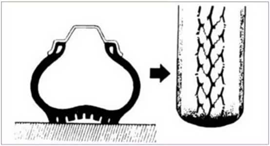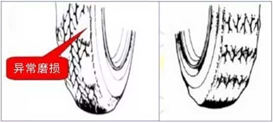 反之,轮胎气压过低,轮胎亏气,轮胎中央收缩,则轮胎两侧肩部磨损。