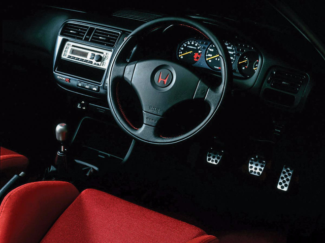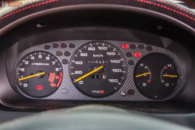 EK9的内饰设计,有着90年代日系性能车典型的特征,红黑经典的运动配色充满驾驶欲望,以至于在第五代TYPE R车型上我们也能找到相似的设计风格。Recaro的赛车座椅从第一代TYPE R至今从未缺席过,包裹性更强、质量更轻的特性可以让车手在过弯时更好的压榨这台车的性能。EK9仪表盘显示的信息依次是转速表、时速表和油量/水温表,从10000转速表的表底显示不难发现,这台发动机是本田惯用的高转速发动机。
