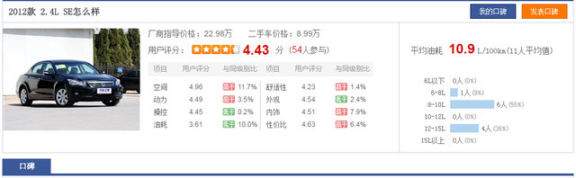 2012款雅阁2.4汽油版综合百公里油耗10.9L