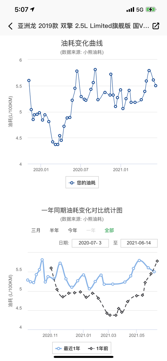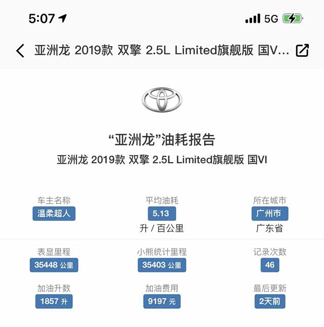 小熊油耗app上亚洲龙双擎记录的油耗,3.5万公里平均百公里油耗5.13L亚洲龙HEV:丰田新一代混动系统“技高一筹”
