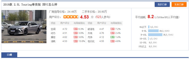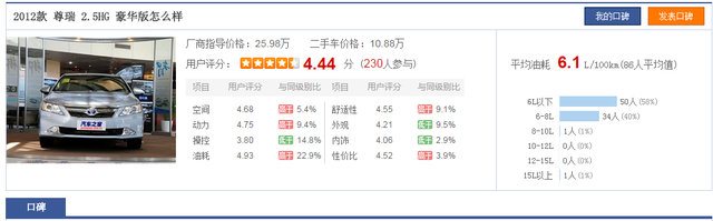 尊瑞2.5HG综合百公里油耗6.1L8年半243次加油共消耗92号汽油12544.93升(丰田双擎的发动机压缩比很高,但却只需要加92号汽油,加95号汽油完全是浪费,后面会讲原因),行驶了196473km,平均百公里油耗6.385升。而艾哥的凯美瑞尊瑞豪华版HG在某论坛上的用户口碑显示平均百公里油耗6.1升,和艾哥的实测结果相当接近。