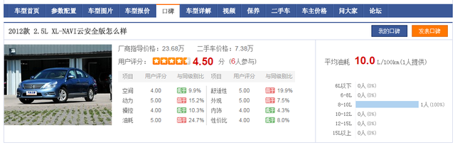 2012款天籁2.5汽油版综合百公里油耗10L再对比该论坛用户口碑显示的2012款凯美瑞2.5L汽油版(10L/100km),以及2012款雅阁2.4L汽油版(10.9L/100km)和2012款天籁2.5汽油版(10L/100km),尊瑞的综合百公里油耗比它们少大概3.6L以上。若按每百公里少3L、每升92号汽油6.5元计算,196473公里已节省油费38312.24元。