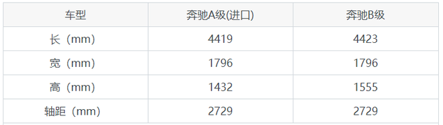 奔驰A级(进口)和奔驰B级尺寸/空间对比