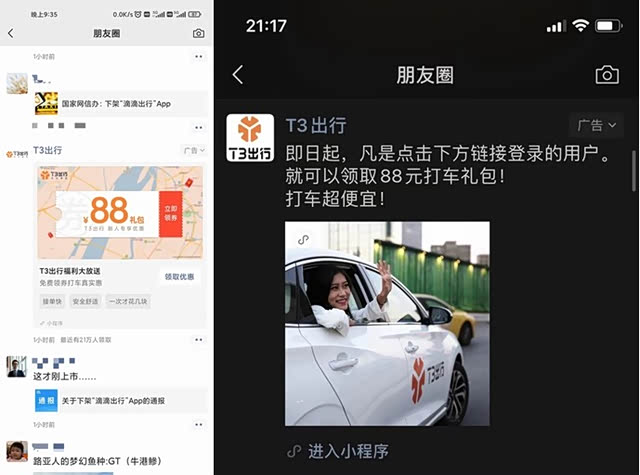 正所谓“前人栽树后人乘凉”,滴滴创造了广大有打车习惯的用户,如今遭遇下架自然而然会有人接盘这一蛋糕,对于竞争对手来说成了意外的惊喜。例如T3出行来这次机会就把握的不错,不少朋友在滴滴下架后都收到了来自T3出行的朋友圈广告,夹杂在朋友圈惋惜滴滴的中间,真是足够机灵。