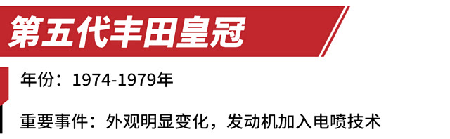 1974年,丰田发布了第五代皇冠,内部代号为S80/S100。这一代丰田皇冠最直接的变化,就是一改第四代丰田皇冠另类的造型设计,转而采用一种方方正正的、类似于美式大型轿车的设计,毕竟在那个年代,方正的线条也代表了沉实稳重。细节方面,第五代丰田皇冠使用了方形轮廓并内嵌四个圆灯,同时还新增加了一个后三角窗,整车变得更富美系车的味道。