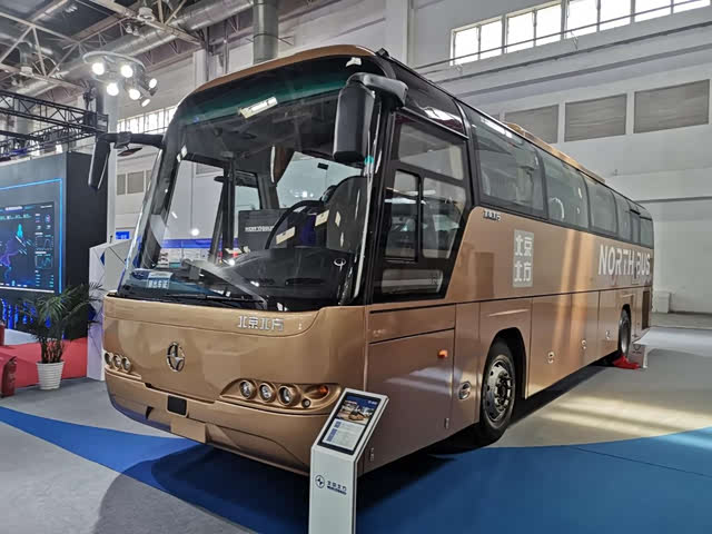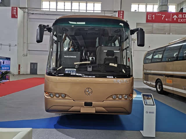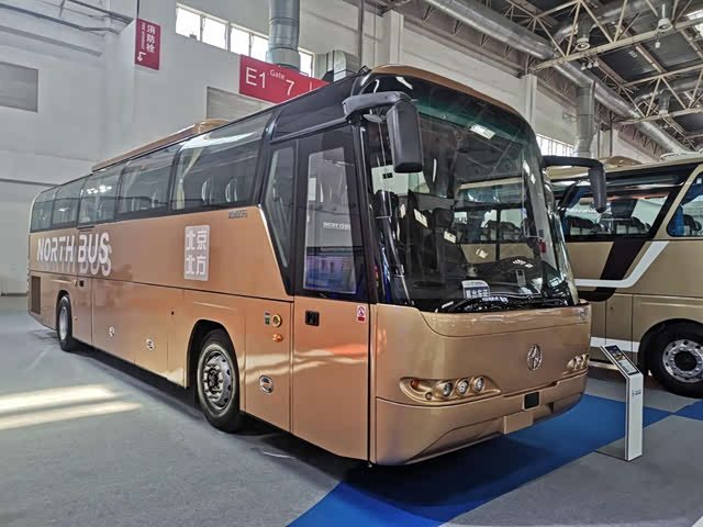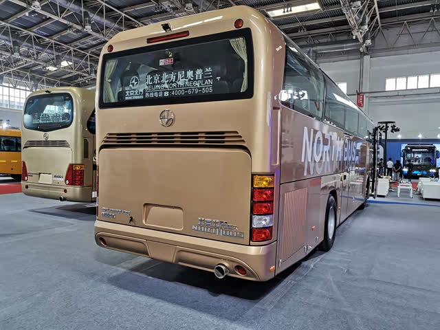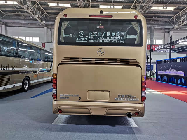 展车仍然延续了北方尼奥普兰的高端与豪华,达到了大型高一级客车等级。这是一种大型旅游客车,车上有49+1共50个座位,其中包括1个驾驶员座位。车上设有两个车门,后门相对比较低,外观上第一眼不太容易看见。车体采用金色涂装,前脸和侧面均有北京北方字样。车体上用NORTHBUS字样,取代了以往较为常用的NEOPLAN字样。想当年,北方将尼奥普兰引进中国,开启了一段辉煌的时代。如今展车的车尾贴有德国技术标贴,想必也是表示对德国技术的肯定和尊重。