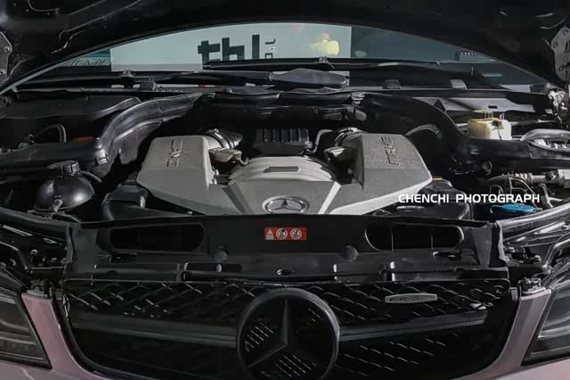 这是一辆2011年出厂的C63 457 AMG,二手过户,全车贴了女生喜欢的车衣,机舱内安放着一台8缸M156985引擎,6.3排量,80升容量的燃油箱,AMG SPEEDSHIFT MCT 7档自动变速箱722.930,底盘型号W204460。