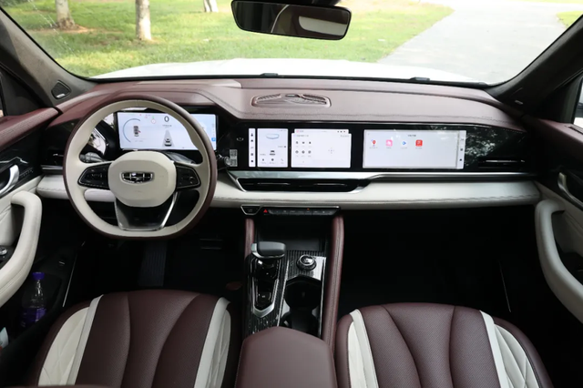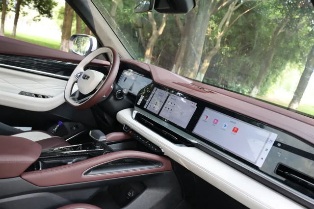 基于这些特点,我们先来看看吉利星越L的表现。吉利星越L定位于A+级SUV,指导售价为13.72-18.52万元。该车中控台嵌入了三块显示精度相当高的液晶屏幕,分别为全液晶仪表、中控车机系统、副驾娱乐系统,三者的尺寸都为12.3英寸。除此之外,其还搭载了一块显示面积为25.6英寸的AR-HUR。