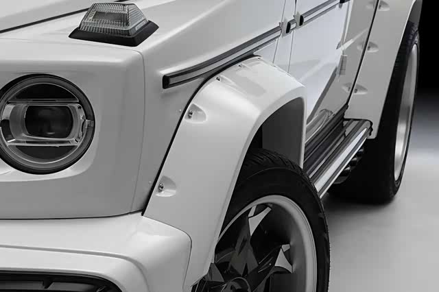 同时加宽的轮眉不仅让奔驰G营造出宽体的冲击力,而且铆钉等细节也进一步加强了车辆的力量感与野性。