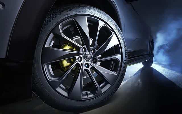 侧面看最显眼的就是20英寸的熏黑哑光刀锋轮毂,再搭配黄色运动卡钳,车尾原有的V字形尾翼两侧加装了纵向扰流板,原来双边共两出的排气系统也被升级为了双边共四出,运动气息非常足。此外,车门还是隐藏把手。