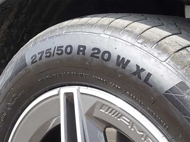 这款轮胎的尺寸是275/50 R20 113W W XL MO,其中113代表承载是1150kg,速度级别W表示速度级别达到270km/h,满足GLE的最高时速250km/h。第二个W代表轮胎具有保护轮圈功能,就是这个凸台高于轮圈,使轮圈避免剐蹭。胎壁上的XL代表超强承载能力,MO代表奔驰原厂认证。