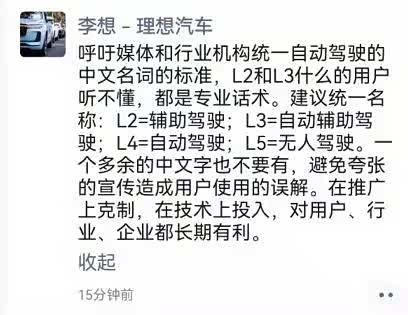 而理想汽车创始人李想则呼吁媒体和行业机构统一自动驾驶的中文名称的标准,比如L2和L3什么的用户听不懂,都是专业话术。建议采用统一名称,比如L2=辅助驾驶,L3=自动辅助驾驶,L4=自动驾驶,L5=无人驾驶。一个多余的中文字也不要有,避免夸张的宣传造成用户使用的误解。在推广上克制,在技术上投入,对用户、行业、企业都长期有利。蔚来尽管在产品介绍中,强调了辅助驾驶的界定,但这并没有为消费者重视。
